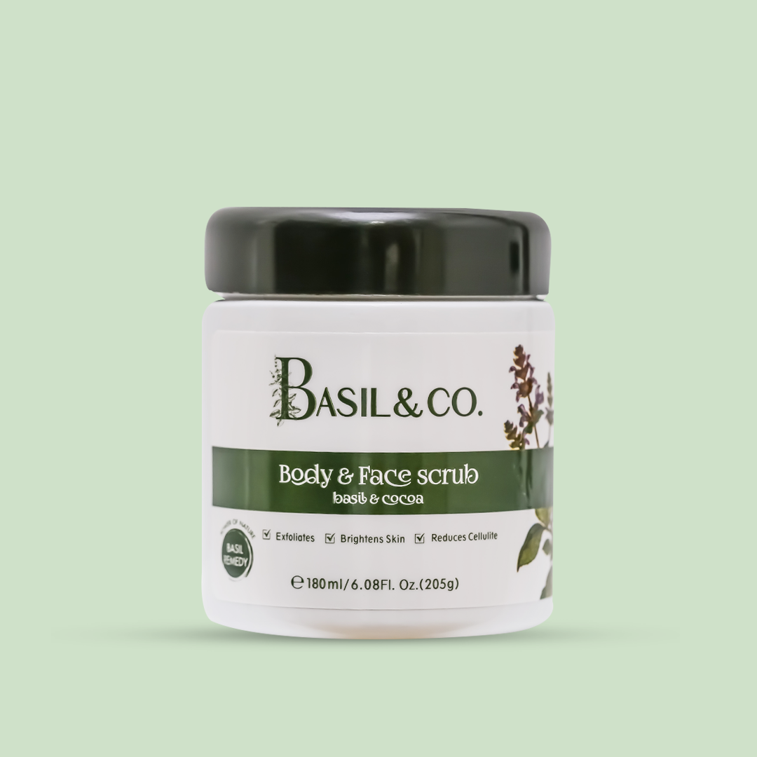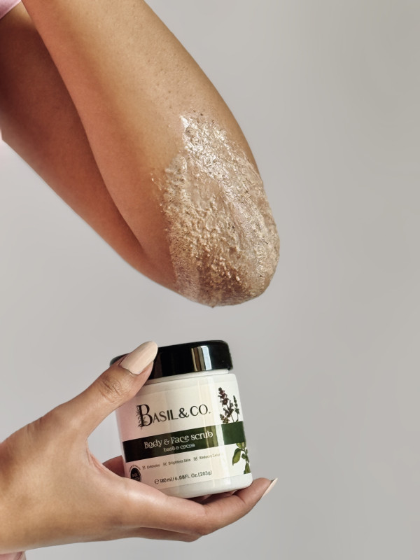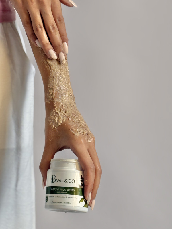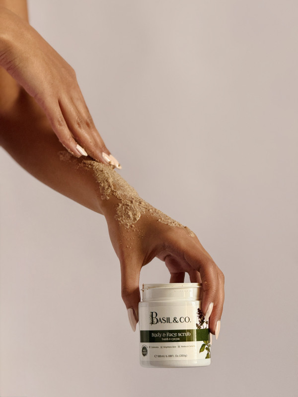 Natural scrub that works gently for your face and body made out of basil and cocoa.